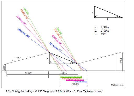 Abb.3: Schrägdach Unterkonstruktion mit 15 Grad Neigung, 2,21 Meter Höhe und  Winkel Alpha von 22 Grad