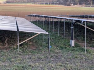 Wie in Abbildung 1 ersichtlich, gibt es Kahl- oder Braunstellen unter dem Schrägdachsystem, die besonnt sind und trotzdem braun. Es mangelt somit nicht an der Sonne, dass es hier so schlecht wächst. Bodenvegetation wächst evolutionsbedingt mit den in jeder Klimazone vorkommenden Regenspenden, was in den Solarparks auch auf den freien Flächen sichtbar ist. Unter die Module gelangt jedoch je nach Konstruktion unterschiedlich viel Wasser. Regen fällt je nach Tropfengröße und Windeinfluss in der Regel mit Neigungswinkeln zwischen 30 und 60 Grad. Während der Regen über die Modulspaltbreite direkt auf den Boden gelangen kann, fließt der Regen auf dem Modul über den Modulspalt oder an der untersten Modulkante ab.  Hier wurden je nach Regenspende in Millimetern das 3- bis 10-fache als Ablaufwassermenge gemessen.
