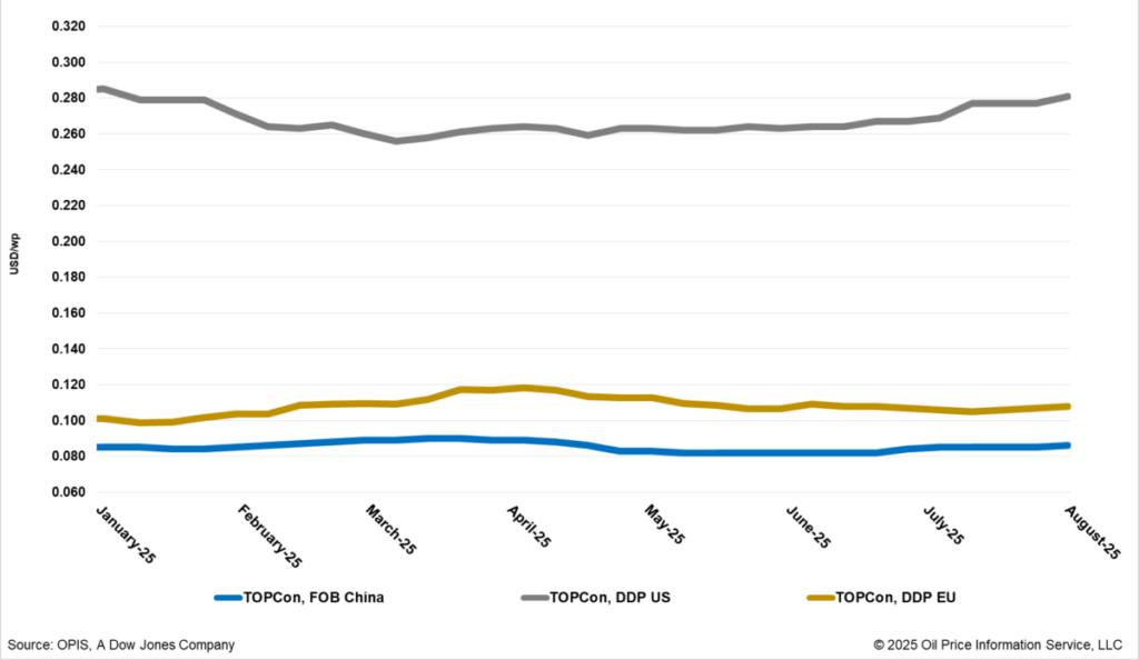 In den USA stiegen die Preise für Topcon-Module ab 600 Watt (DDP US) in dieser Woche um 1,44 Prozent auf 0,277 US-Dollar pro Watt. Lieferungen aus Südostasien zogen um 1,14 Prozent auf 0,267 US-Dollar pro Watt an – eine Folge gegenseitiger Zölle. Module aus Indien gaben dagegen um 1,86 Prozent auf 0,317 US-Dollar pro Watt nach, belastet durch die laufenden Untersuchungen zu Anti-Dumping- und -Subventionsszöllen.