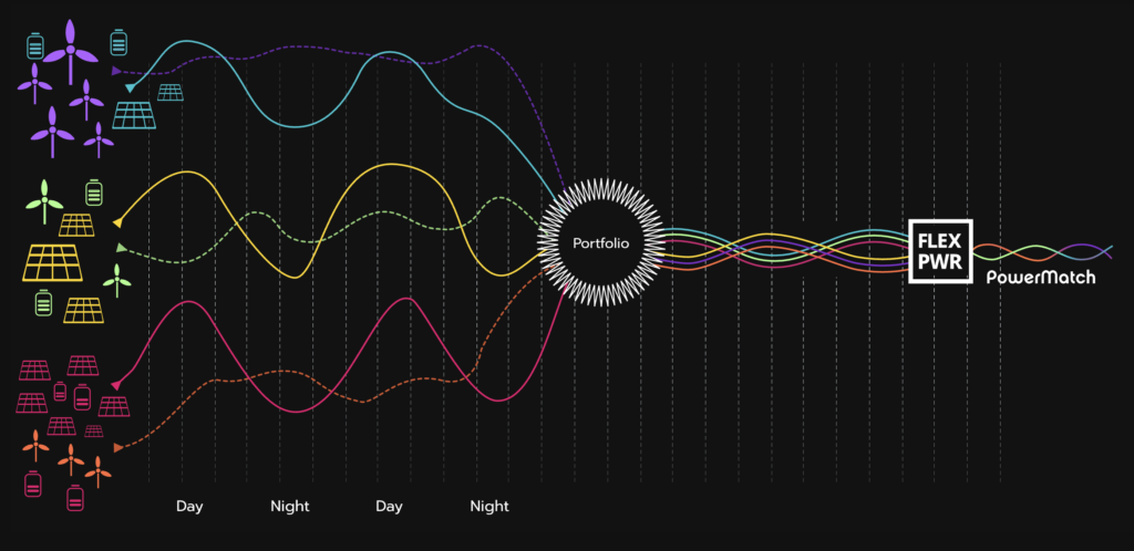 Das Ganze funktioniert, weil die Erzeuger PPAs mit FlexÂpower eingehen und die Abnehmer ihrerseits ihre Verträge mit Flexpower abschließen. Es handelt sich bei Powermatch also nicht um eine PPA-Vermittlungsplattform. Flexpower stellt eher grüne Energie aus einem Portfolio von Solar, Wind, Batterien, Biomasse und Wasserkraft zur Verfügung, die es dann an Abnehmer verkaufen kann. Die Preisbildung unterscheidet Flexpower dann von einem klassischen Stromversorger. Die Parteien sind daran nämlich direkt beteiligt, indem sie auf der Plattform ihre Preise angeben, die sie bereit sind zu zahlen, oder zu denen sie bereit sind zu verkaufen.