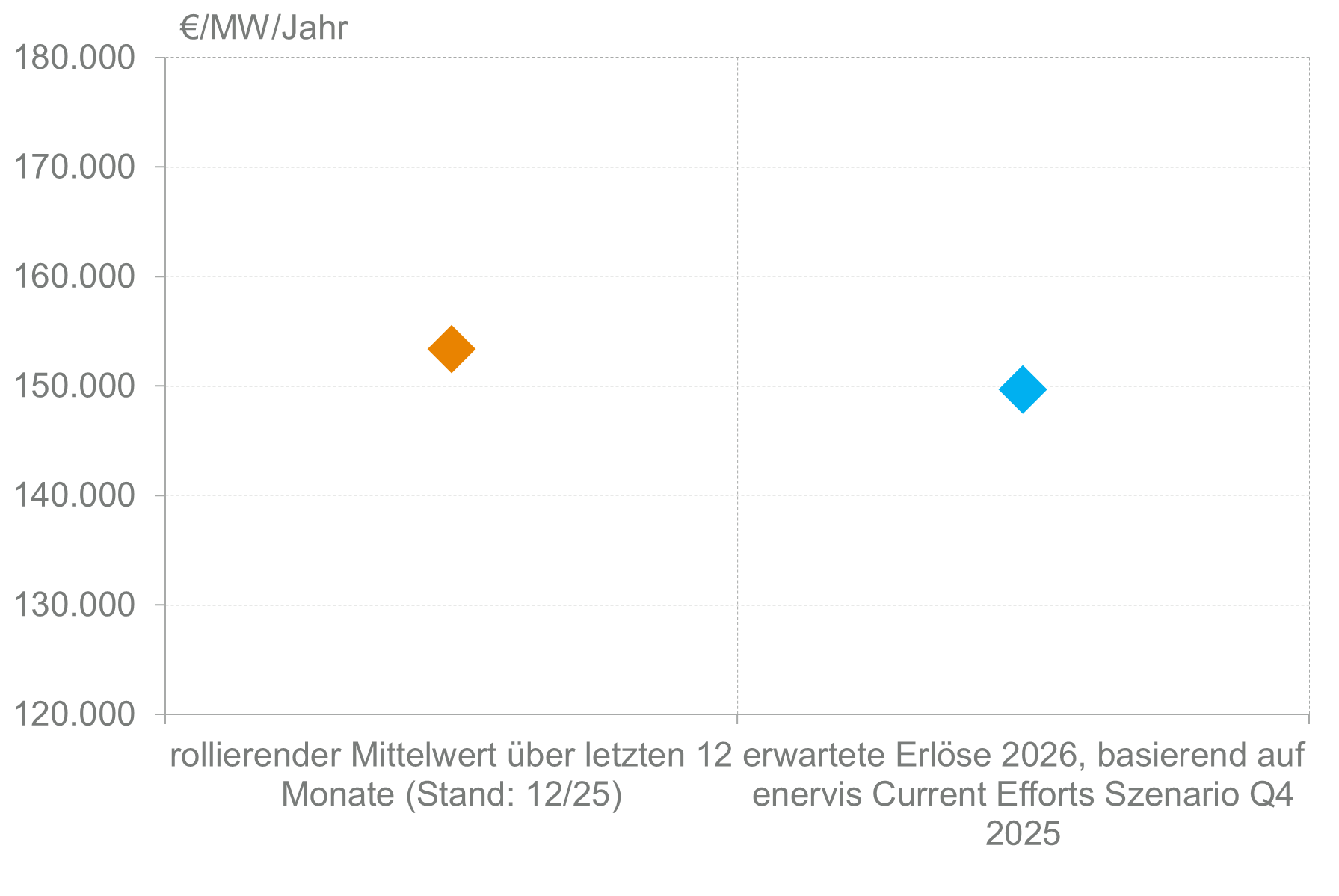 Für die erzielbaren Erlöse im Jahr 2026 liegt weiterhin unser Current Efforts Szenario Q4/2025 zugrunde eine Aktualisierung des Szenarios erfolgte in diesem Monat nicht. Die prognostizierten Erlöse liegen aktuell bei 149.600 Euro pro Megawatt und Jahr.