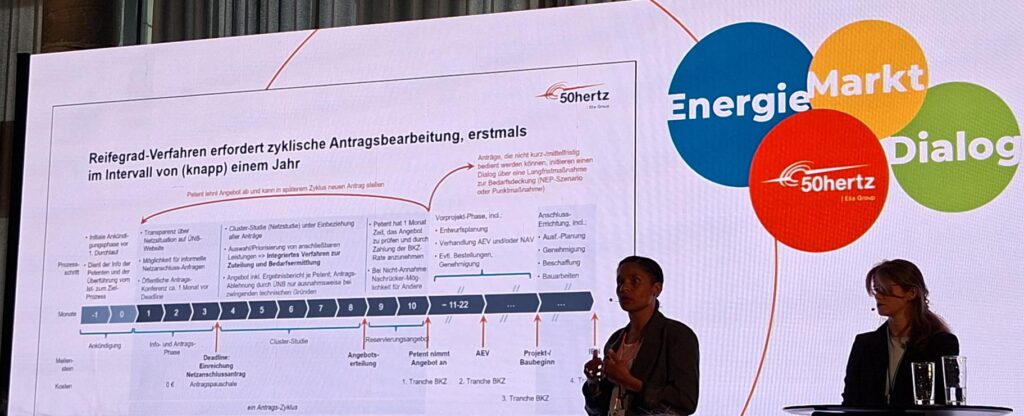 Valerie Bischof wirft schließlich das sogenannte „Reifegrad-Verfahren“ an die Wand. Damit verbunden sei eine zyklische Antragsabarbeitung, die weniger als ein Jahr dauern soll. Das unter den Übertragungsnetzbetreibern geeinte Verfahren ist in verschiedene Phasen untergliedert.