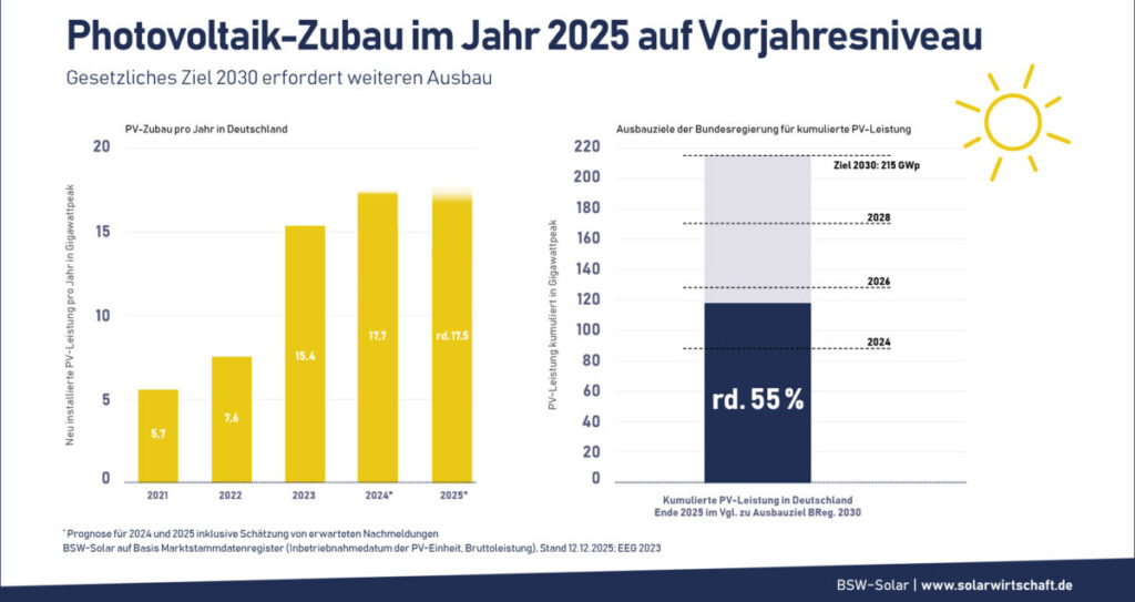 Nach einer vorläufigen Auswertung der Zahlen des Marktstammdatenregisters schätzt der Bundesverband Solarwirtschaft (BSW-Solar) den Photovoltaik-Zubau für 2025 auf etwa 17,5 Gigawatt. Dies liegt etwa auf dem Niveau von 2024, als Photovoltaik-Anlagen mit 17,7 Gigawatt neu installiert wurden. Aufgrund der Meldefrist für neue Anlagen von vier Wochen nach der Inbetriebnahme lassen sich aktuell noch keine finalen Zahlen aus dem Marktstammdatenregister extrahieren.