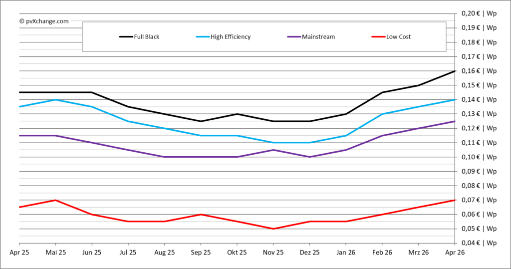 Im vierten Monat in Folge sind die Modulpreise wieder über alle Technologieklassen hinweg gestiegen. Zwar ist der Anstieg nicht mehr so rasant, wie noch Anfang des Jahres, aber er konnte auch noch nicht gestoppt werden. Im Durchschnitt kletterten die Preise von März zu April nochmals um 5,5 Prozent nach oben, wobei Full-Black-Module den größten Preissprung zu verzeichnen haben. Die Gründe dafür liegen nicht unbedingt auf der Hand, da auf der Produktionsseite eher gegenläufige Trends zu finden sind. Die Preise für Polysilizium beispielsweise befinden sich aufgrund einer schwachen weltweiten Nachfrage seit Wochen im Sinkflug. Auch die Streichung des bisherigen Exportsteuerrabatts durch die chinesische Regierung, die am 1. April dieses Jahres in Kraft getreten ist, sollte seit Monaten bereits eingepreist sein.